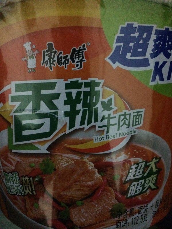 康师傅 香辣牛肉面桶装143克每100克营养成分含有484大卡(100克),脂肪(克):27.50,纤维素(克):一,碳水化合物(克):52.30,蛋白质(克):7.10
