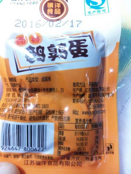 骥洋食品 鹌鹑蛋(卤香)每100克营养成分含有194大卡(100克),脂肪(克):14.00,纤维素(克):一,碳水化合物(克):0.00,蛋白质(克):14.80